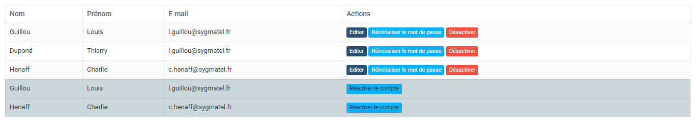 Il est possible de modifier l'identifiant, l'e-mail, le nom, le prénom. Les restrictions, l'unicité de l'identifiant et la validité de l'adresse mail, restent les même que lors de la création d'un utilisateur.