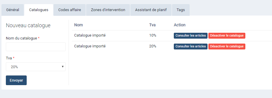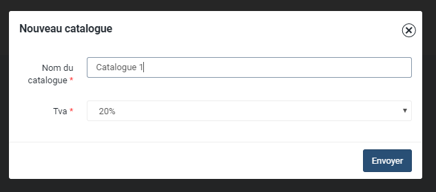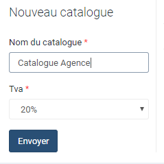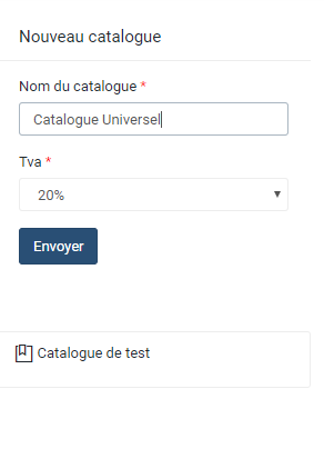Pour créer un catalogue, aller sur le formulaire à gauche intitulé "Nouveau catalogue", renseigner les champs "Nom du catalogue", choisir un taux de TVA et cliquer sur le bouton "Envoyer".