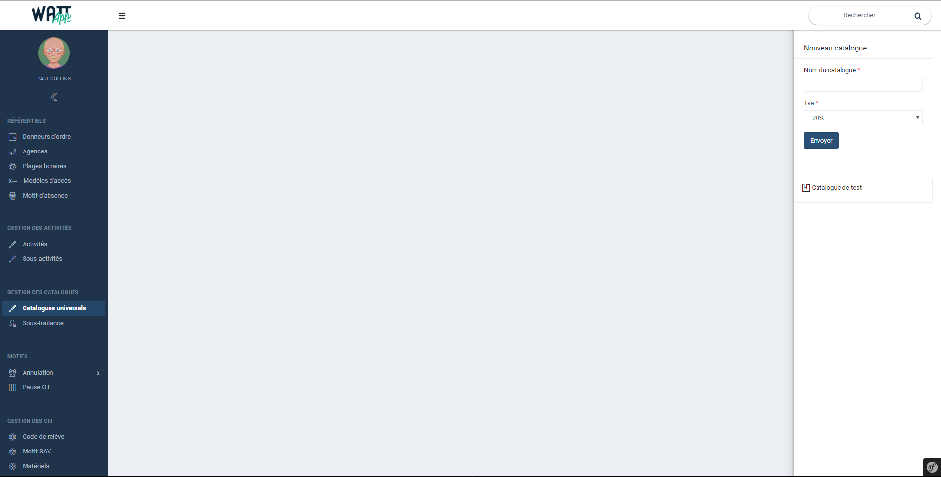 Le catalogue universel est un catalogue commun à toutes les agences renseignées dans WattApp. Cela signifie que toutes les agences peuvent recourir à cet article lors d'une valorisation (article négocié pour l'ensemble du groupe par exemple).
