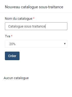 Pour créer un catalogue, cliquer sur "Nouveau catalogue" et renseigner les champs "Nom du catalogue", choisir un taux de TVA et cliquer sur le bouton "Envoyer".