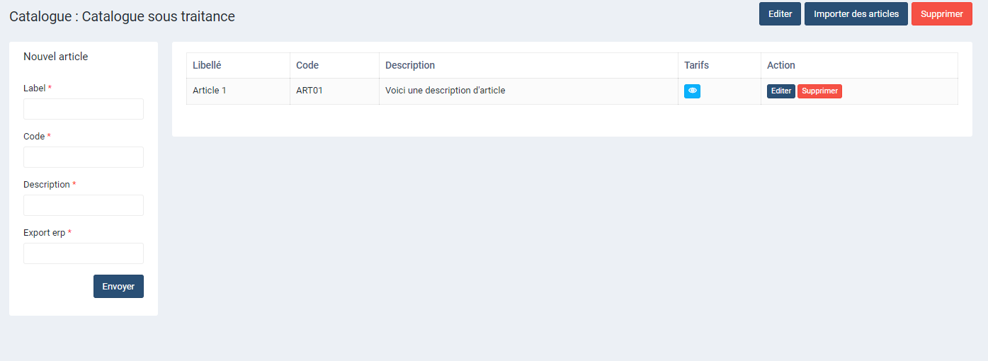Un article est lié à un catalogue, créé depuis ce dernier. Pour créer un article sur un catalogue, aller sur la fiche de celui-ci.