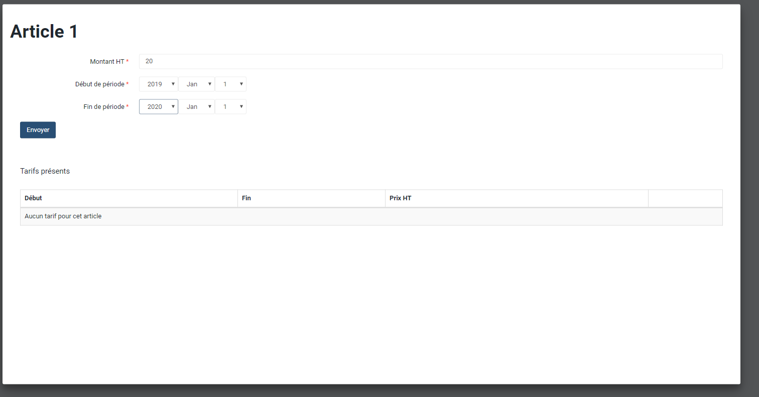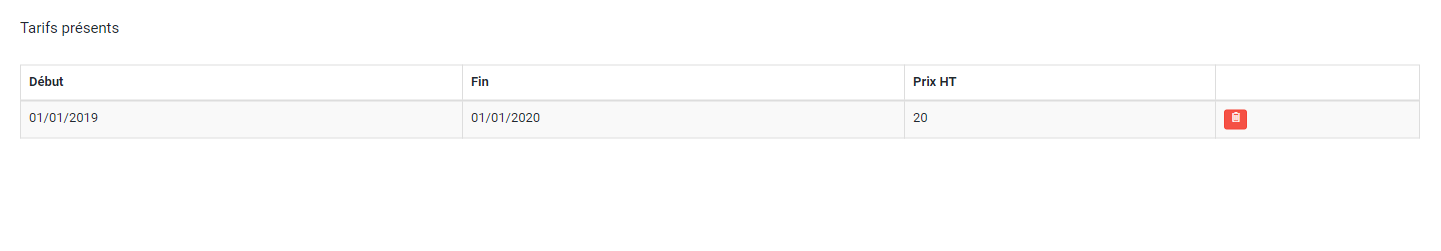 Sur l'exemple, aucun tarif n'est encore attaché. Pour en créer un, renseigner un montant dans le formulaire et choisir la période de validité du tarif.