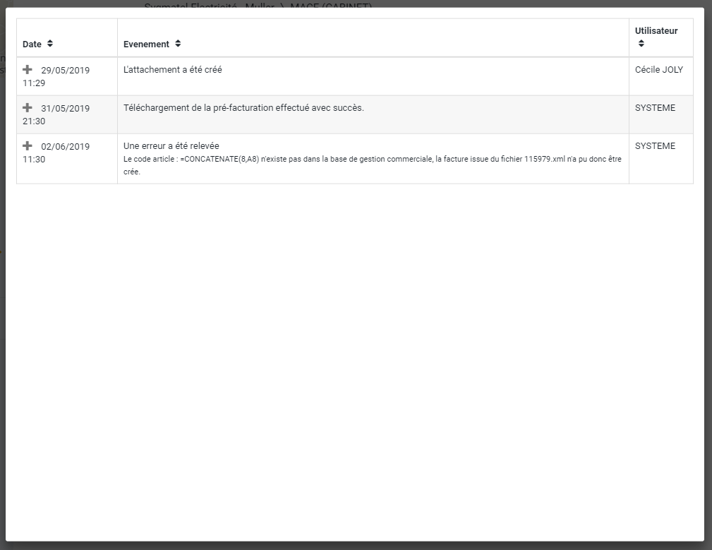 S'affichera alors une nouvelle modale avec une liste d'événements depuis la création de l'attachement.