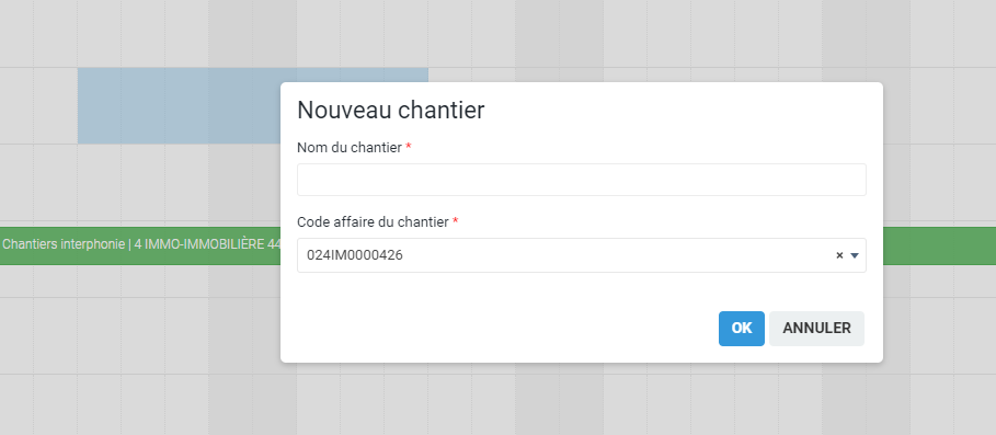 Pour créer un chantier, sélectionner une plage définie sur le calendrier et relâcher. Un formulaire apparaît alors pour créer le chantier. Le chantier demande un libellé, ainsi qu'un code affaire pour être créé. Appuyer sur OK une fois tous les champs remplis.