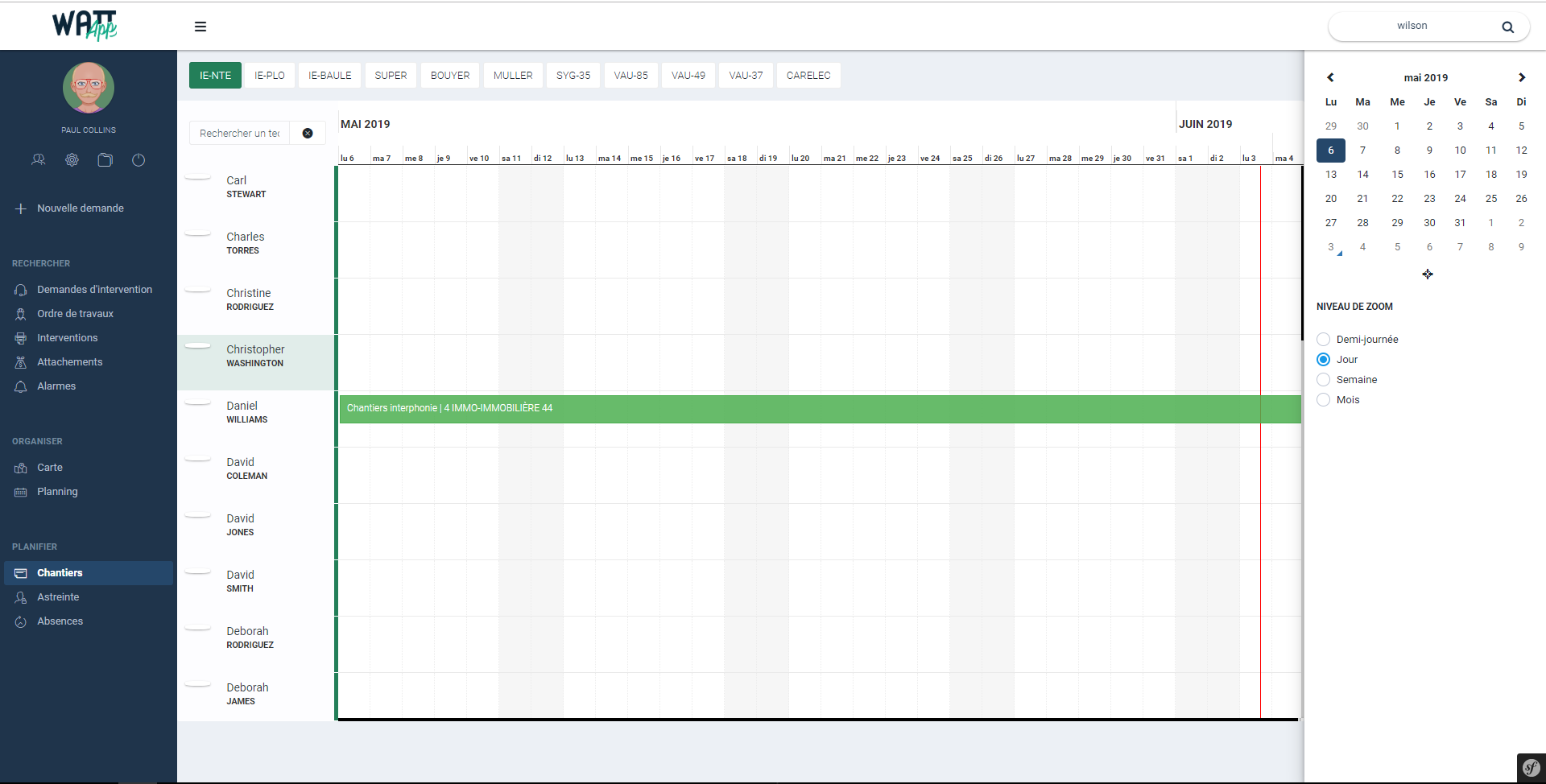 Ainsi, il est possible d'attribuer un chantier à un technicien en un clic pour une semaine complète par exemple.