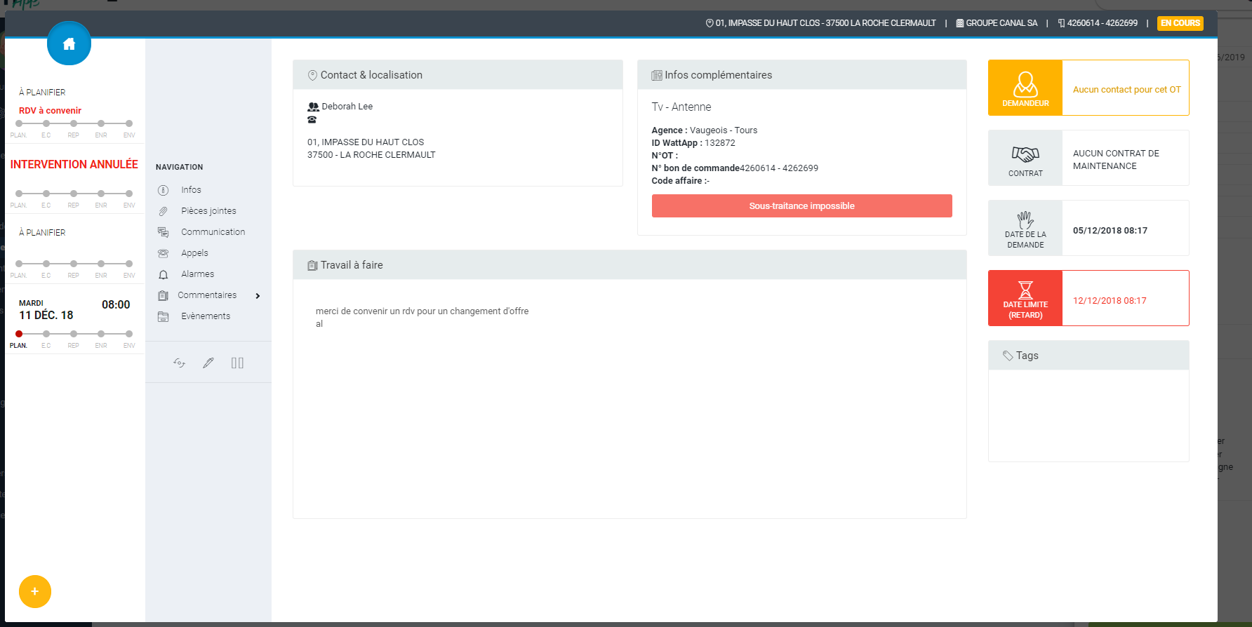 À la droite de la liste des interventions se trouve une barre grise de navigation. Sur la partie supérieure, la carte affiche la position de l'intervention. L'encart intitulé "Navigation" situé juste en dessous présente les différentes pages disponibles pour l'OT ouvert. Par défaut, c'est la page "Infos" qui est ouverte.