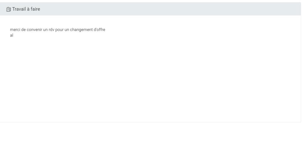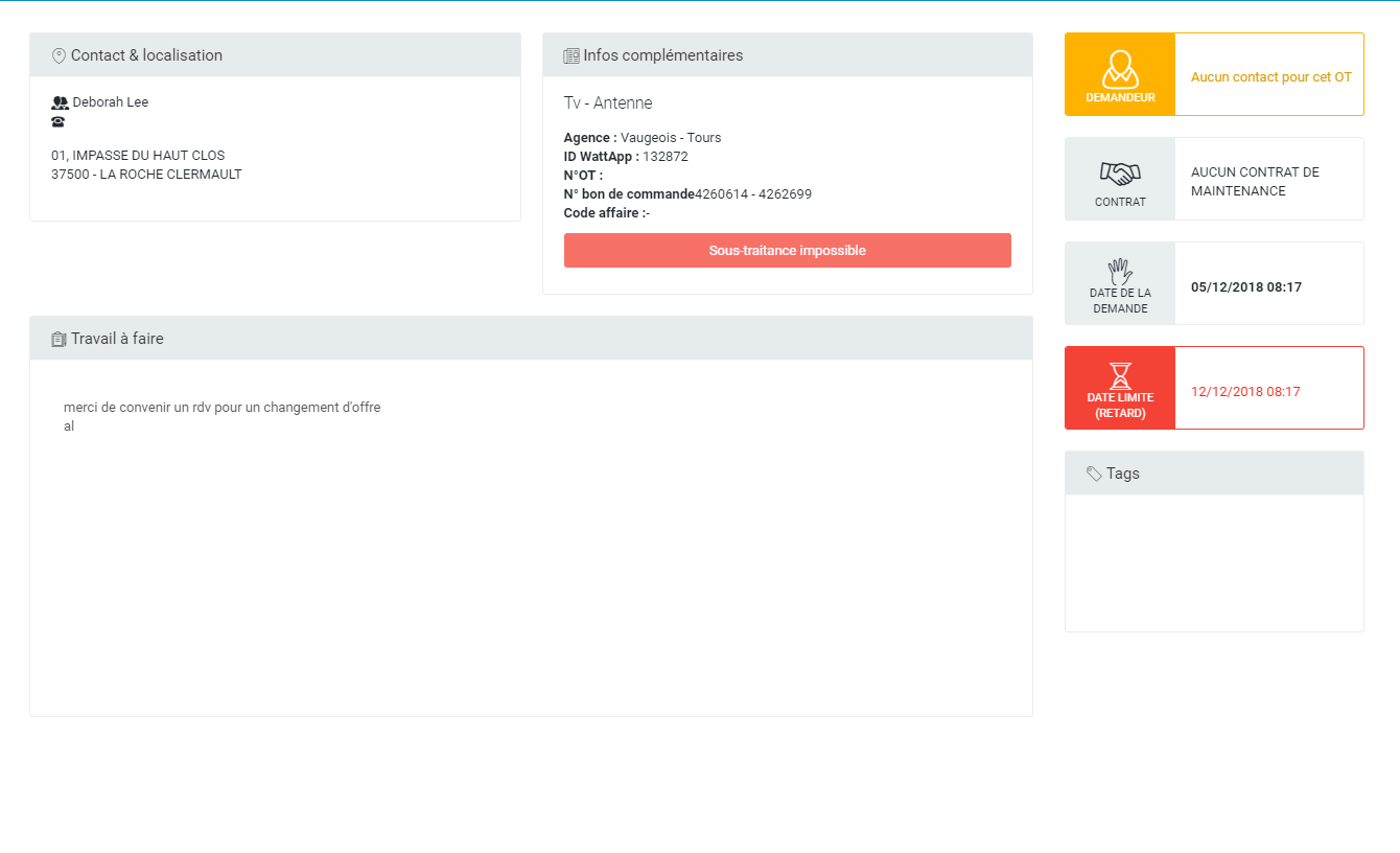 Cette section reprend la demande du client. C'est une section modifiable, il n'est pas nécessaire de repasser par l'éditeur d'OT pour le modifier. Pour modifier le travail à faire, cliquer dans la zone où le texte est écrit puis taper / modifier selon les besoins. Pour sauvegarder les modifications, cliquer en dehors du champs "Travail à faire" ou sur un autre lien.