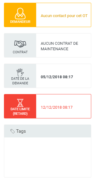 Pour permettre une recherche plus facile, il est possible d'attribuer des tags à un OT. La liste des tags présentée est la liste des tags disponibles pour l'agence d'origine. Si des tags sont déjà actifs, ils auront le fond vert. Pour activer un tag, cliquer dessus. Celui-ci prendra un fond vert une fois actif. Pour le désactiver, cliquer dessus à nouveau, il reprendra alors un fond gris.