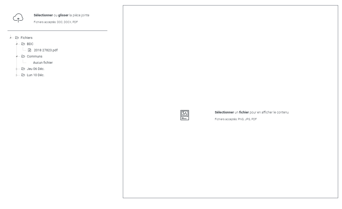Les documents sont listés sous la forme d'une arborescence de fichier (type Windows par ex). Pour ouvrir un dossier, cliquer sur la flèche du dossier. Si des fichiers sont dans les dossiers, ils s'afficheront sous forme de fichier. Pour consulter le contenu d'un fichier, cliquer dessus. A droite, une visionneuse s'ouvrira avec la possibilité de zoomer sur le fichier (qu'il soit PDF ou une image).