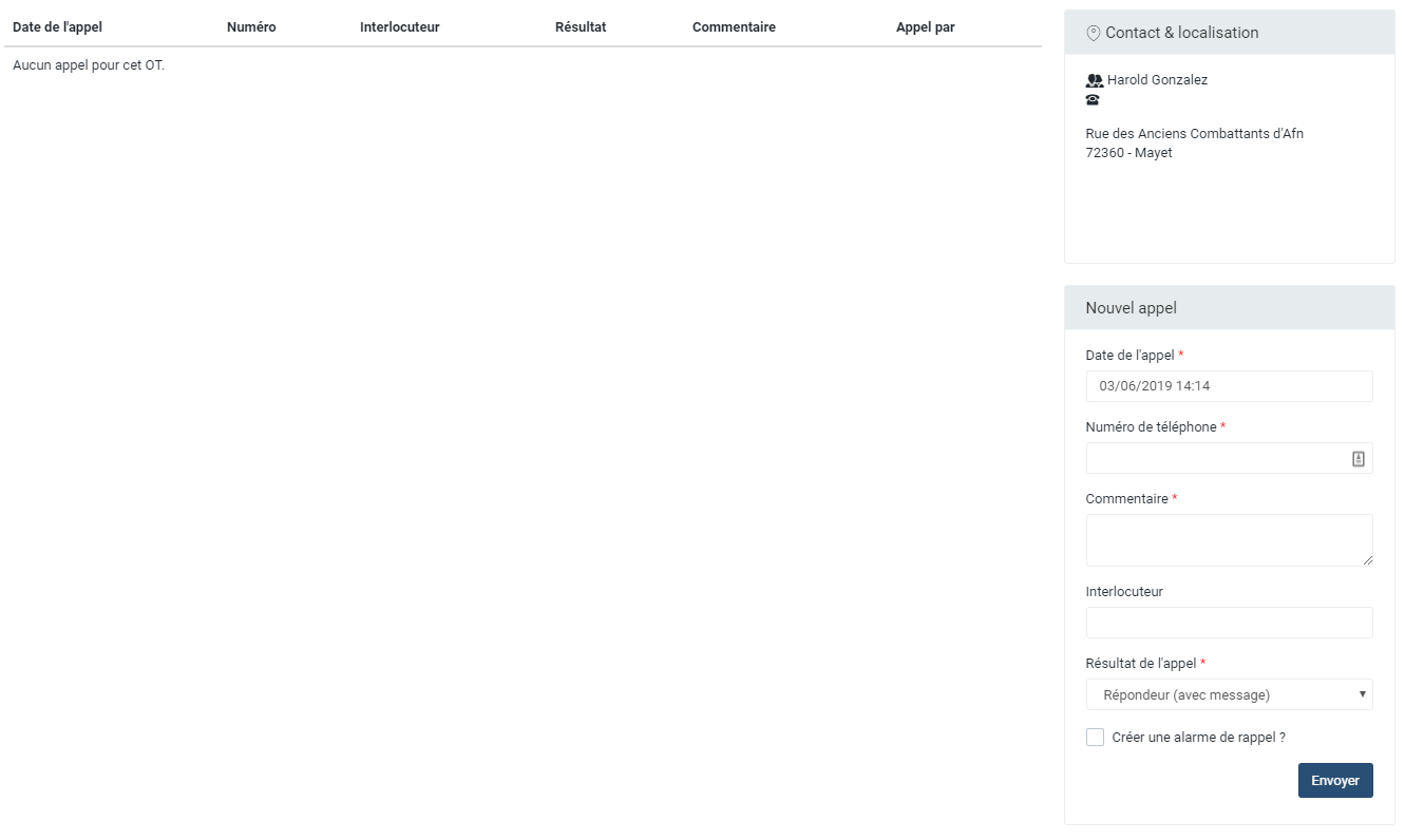 Pour permettre à plusieurs personnes de pouvoir traiter un OT, il est recommandé d'avoir un historique des contacts pris avec le contact sur site ou le donneur d'ordre. La fonctionnalité de suivi des appels est alors pratique pour tenir un registre des appels tenus.