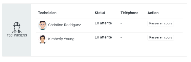 Sous la barre de progression se trouve un tableau avec les techniciens assignés à l'intervention. Dans le tableau, chaque ligne correspond à un technicien. Une ligne contient les informations suivantes :