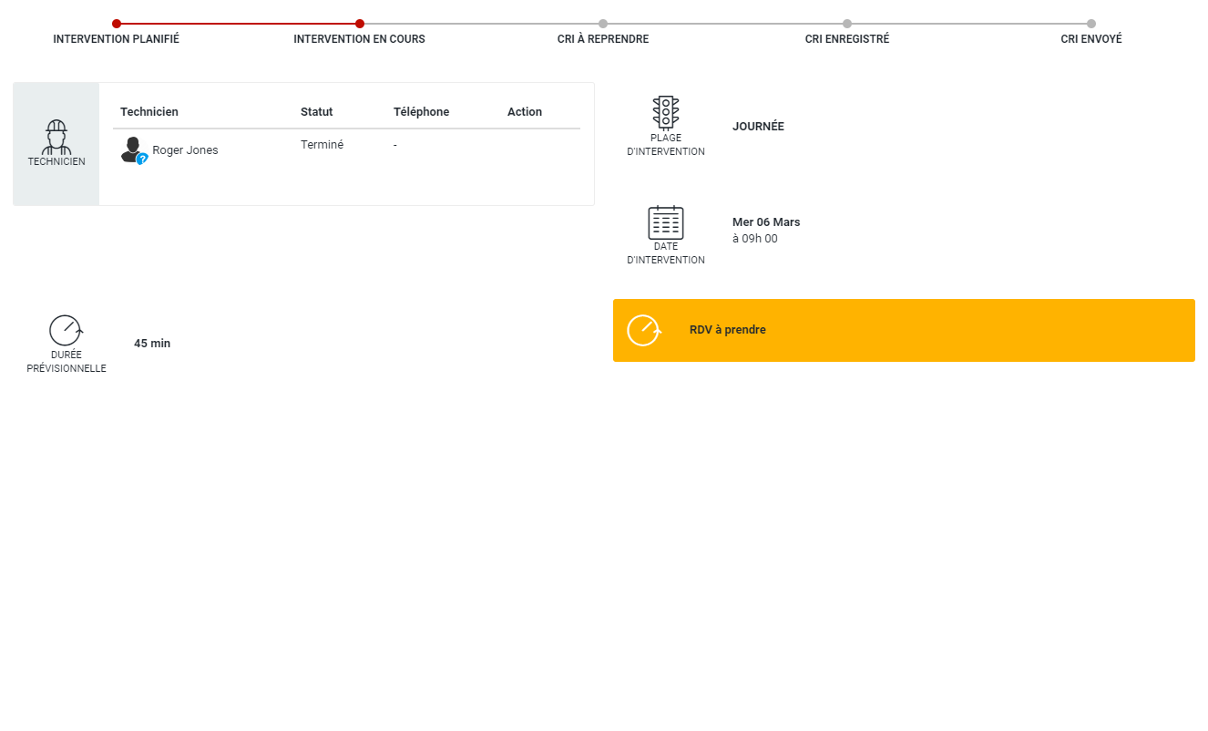 La partie haute de la page reprend la timeline utilisée dans la liste des interventions à gauche. Elle représente le statut actuel de l'intervention.