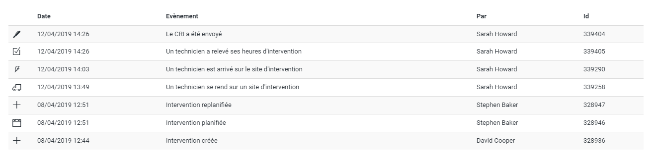 La liste des événements est triée par date dans l'ordre décroissant. Ici, chaque action notable sur l'intervention est enregistrée et consultable.