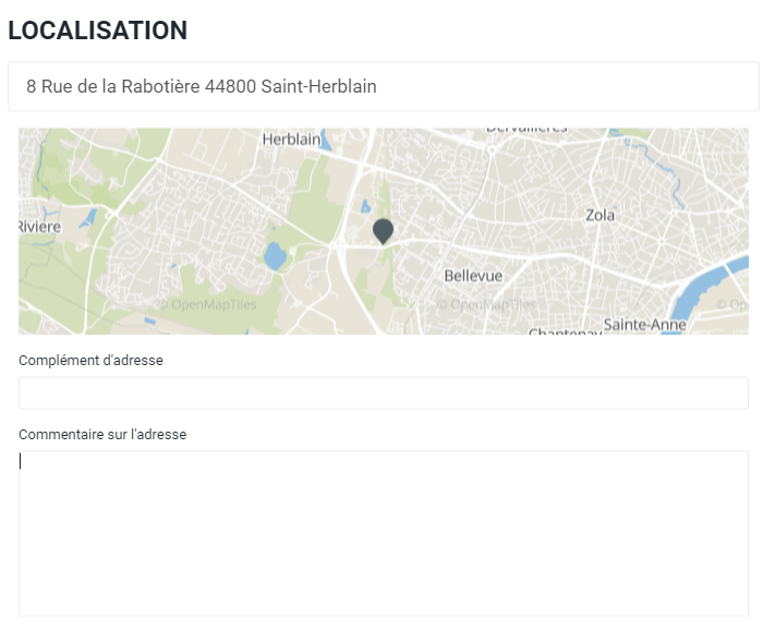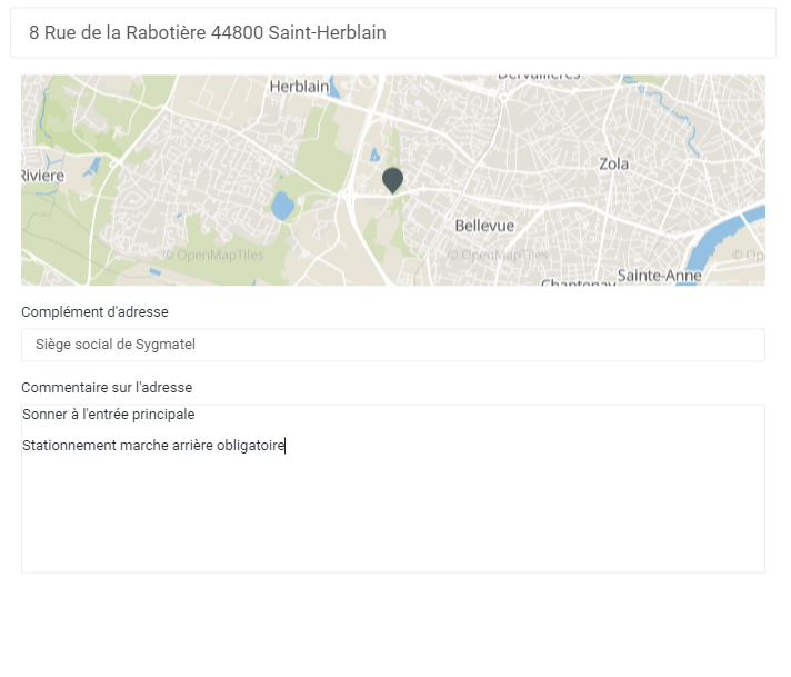 Sous la carte, il est possible de renseigner un libellé d'adresse ainsi qu'un commentaire (invisible au client). Si l'adresse existait déjà dans la base de donnée, il est possible que des informations y soient déjà renseignées.