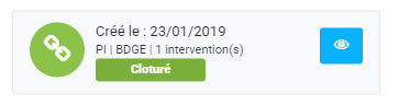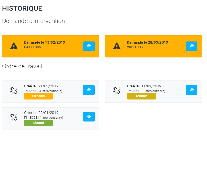 Il est possible d'afficher le détail du bloc-note d'une demande d'intervention ou d'ouvrir directement le hub d'une ordre de travail. Sur chacune des vignettes, quelques détails sont renseignés: