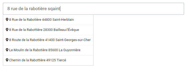 Pour rechercher une adresse, taper dans le champs texte l'adresse. Le service d’auto complétion viendra proposer des adresses en fonction de la recherche. Comme sur Google, plus la recherche sera précise, plus le résultat pourra l'être.