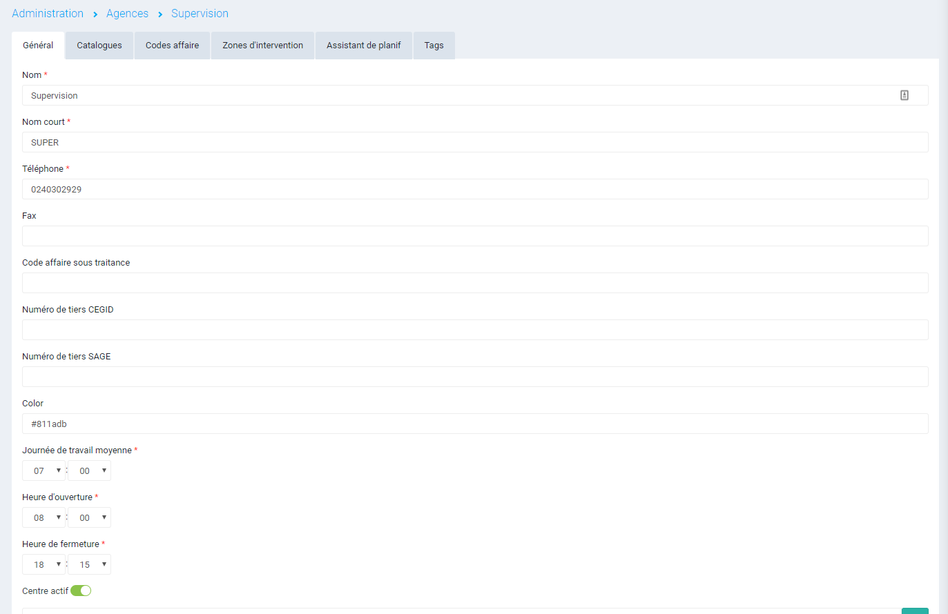 Une fois la fiche d'agence ouverte, plusieurs onglets sont disponibles :