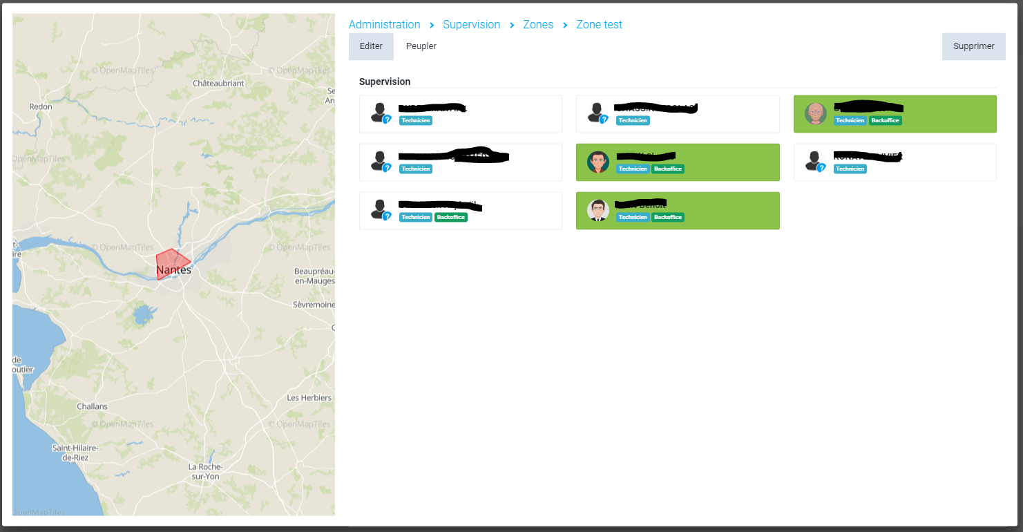 Pour peupler une zone, ouvrir la fiche d'une zone et cliquer sur l'onglet "Peupler". S'affiche alors une liste des techniciens, seulement ceux de l'agence concernée. Si un technicien est sur fond vert, c'est qu'il est attribué à la zone. Sinon, il sera sur fond blanc.