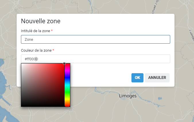 S'ouvrira alors un formulaire pour définir un titre à la zone (attention à bien être précis). Cliquer sur le champ "couleur de la zone" pour ouvrir un sélecteur de couleur. Cette couleur sera utile pour l'affichage des zones sur la carte par exemple.