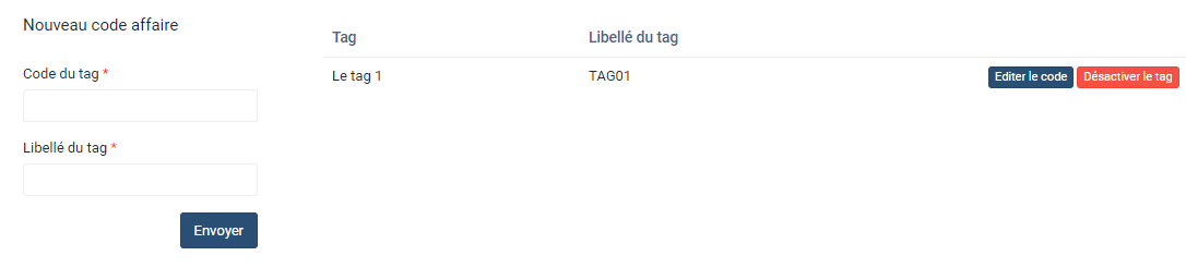 A gauche se trouve le formulaire de création et d'édition des tags. Pour créer un nouveau tag, renseigner le code et le libellé du tag puis cliquer sur Envoyer. Le tag sera alors créé ou édité.