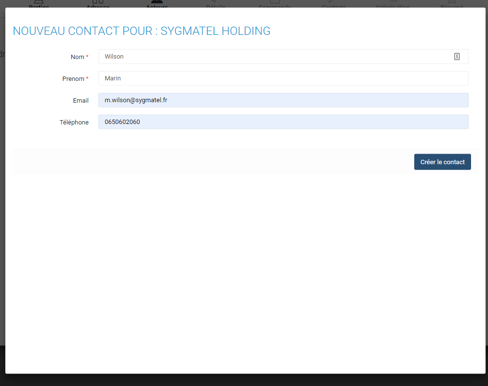 Renseigner les champs nécessaires puis cliquer sur le bouton "Créer le contact"