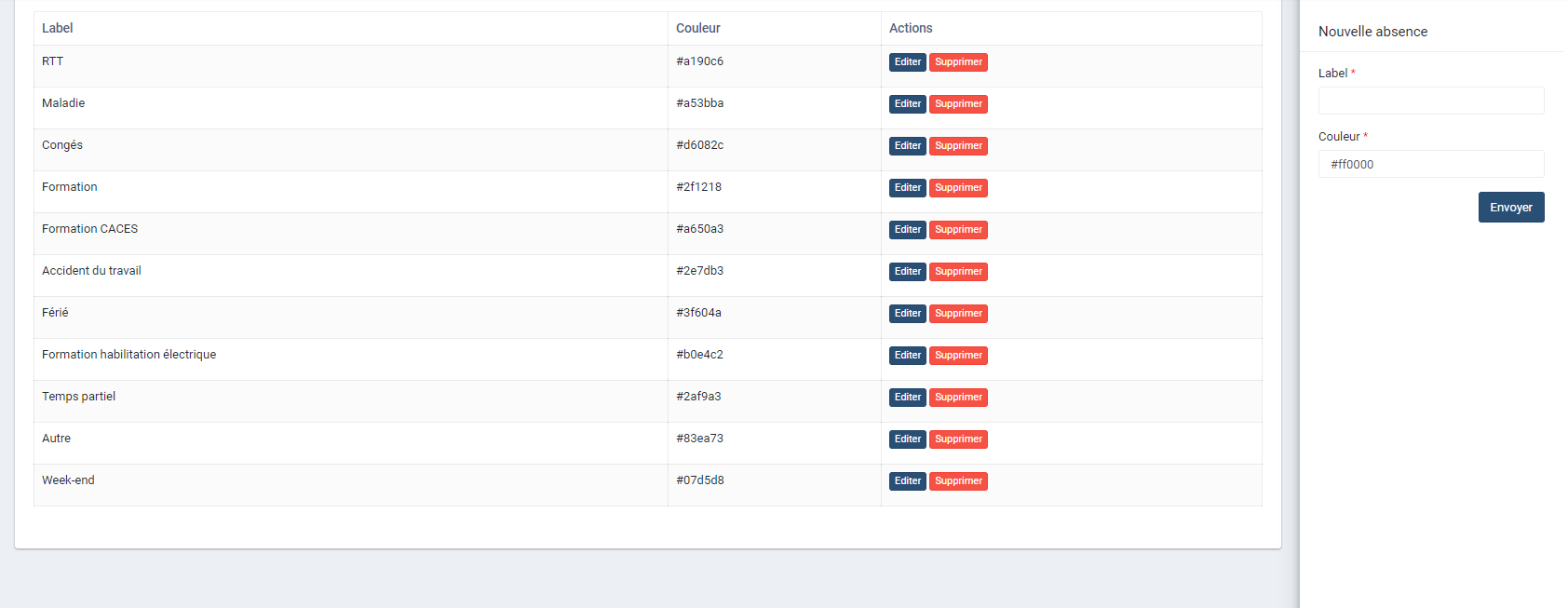 Pour créer un motif d'absence, définir le libellé d'absence puis cliquer sur le champ "Couleur", un sélecteur de couleur apparaît alors. Choisir une couleur, puis cliquer sur "Envoyer".