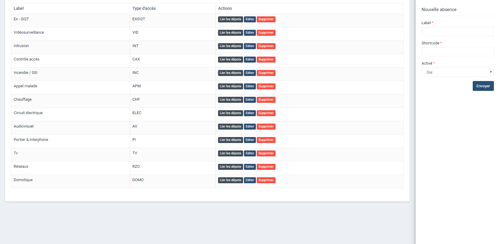 Chaque a un libellé, un code ainsi que trois boutons d'actions :