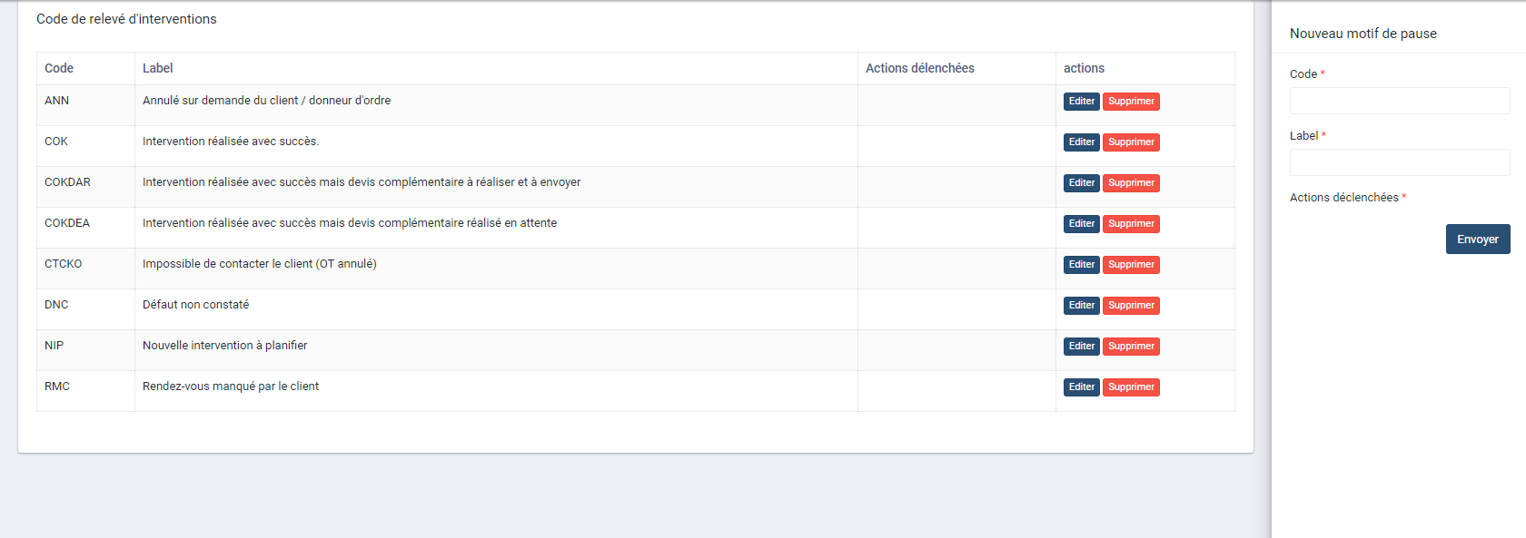 Le but des actions déclenchées est d'automatiser certaines tâches récurrentes en fonction d'un code de relève. Par exemple envoyer un mail, mettre l'OT en pause etc.