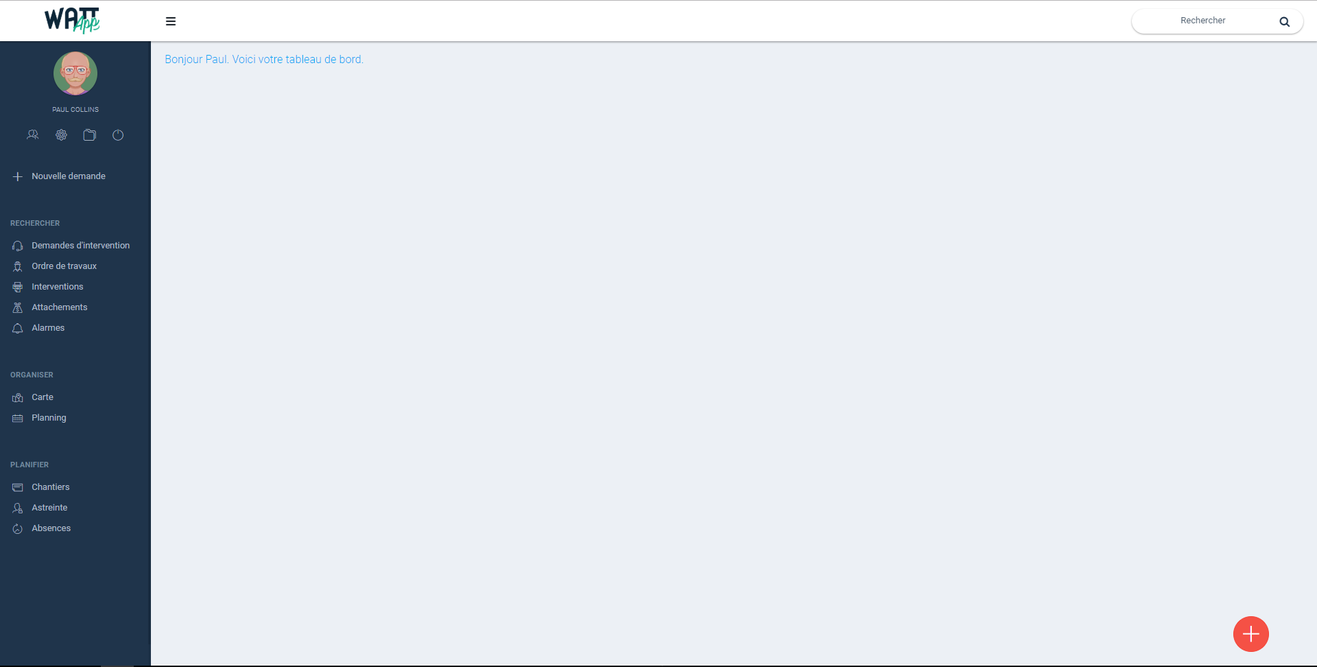 Chaque utilisateur possède un tableau de bord qui lui est propre. Le tableau de bord est le premier écran qui est présenté à l'utilisateur lors de sa connexion. Au début il est vide, mais au fur et à mesure que l'utilisateur personnalise son interface, elle va se remplir pour fournir des indicateurs qui lui sont utiles et faciliteront son expérience sur WattApp.